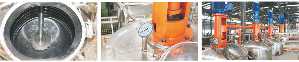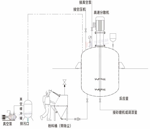傳統的設備是敞口的攪拌罐,采用人工投料方式,粉塵污染大。我公司采用全密封生產方式,真空負壓進料,在密封容器中安裝高速分散機,無粉塵污染。高速分散機帶冷卻水的機械密封、NSK軸承、彈性聯軸器等工藝,品質保證,維修方便。