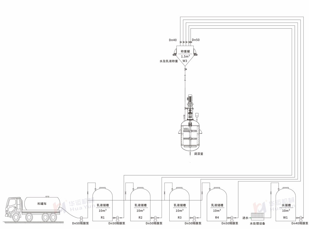 乳液由槽罐車運輸進入廠后通過隔膜泵打入乳液儲罐存放。