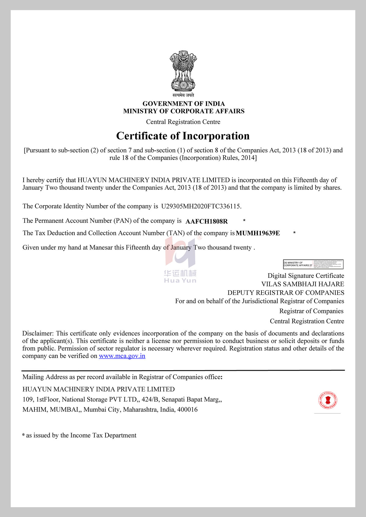 印度分公司營業執照及稅務證